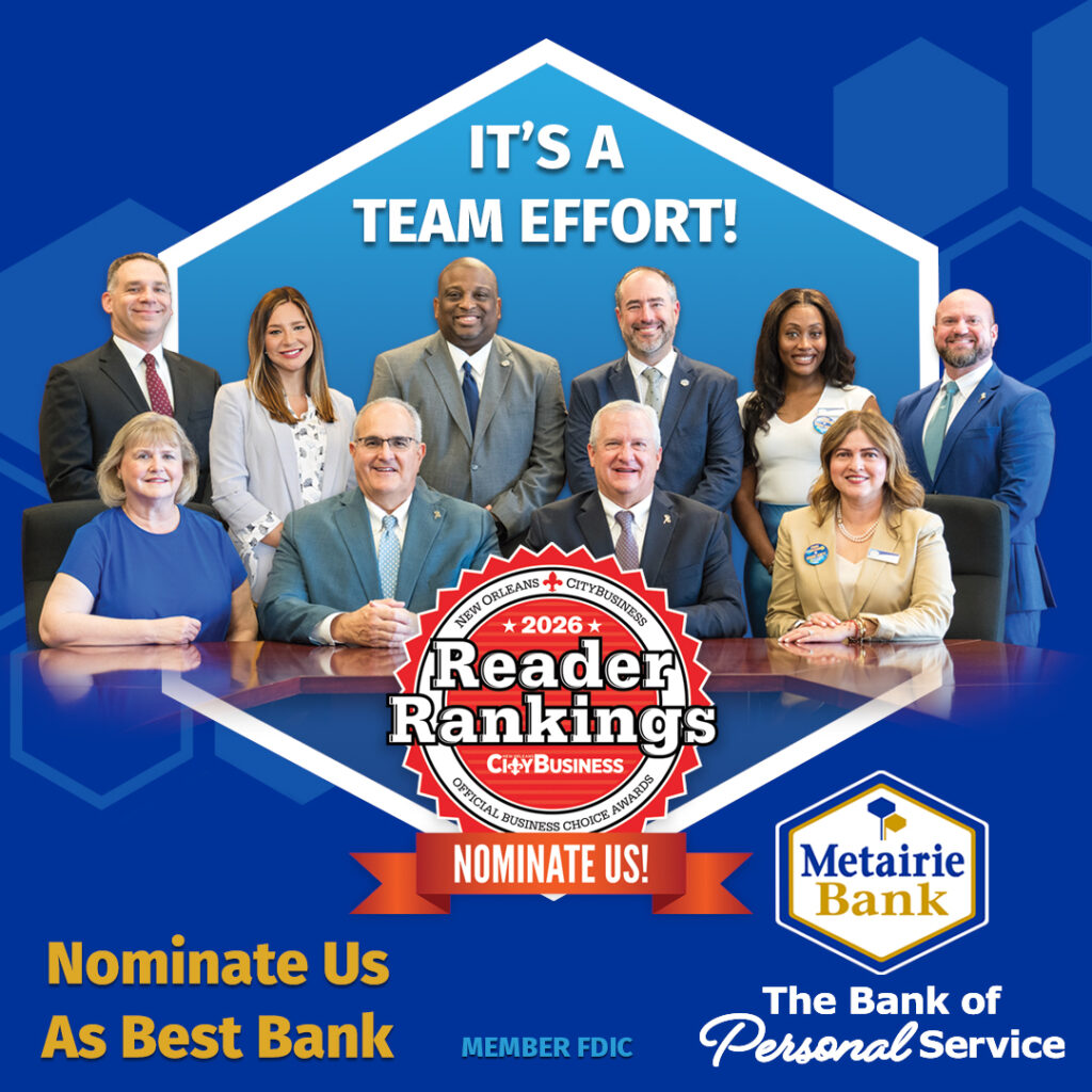 Nominate Metairie Bank for CityBusiness Reader Rankings as the best bank! As a locally-owned institution, we pride ourselves on providing exceptional customer service and personalized financial solutions. Your nomination helps us continue to grow and serve our community with excellence. Thank you for your support! We’d love to be nominated for 2026!